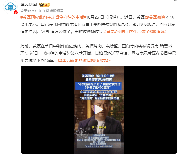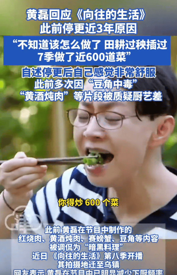 10月26 日(报道)。近日,黄磊在访谈中表示,自己在《向往的生活》节目中平均每集制作6道菜,累计约600道,回应此前停更原因,他表示:“做了7季的饭,98集每天就你炒六个菜,你得炒600个菜,田种过,秧插过,当年为什么停下来,就是因为我们不知道该怎么做了,我停下来的时候,我特别的舒服。”